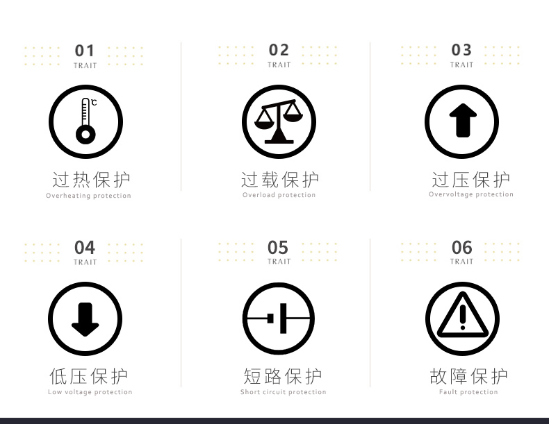 - 保護功能:過壓,低壓,過載,短路,過熱保護